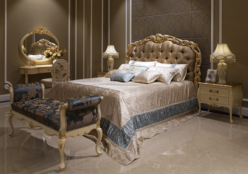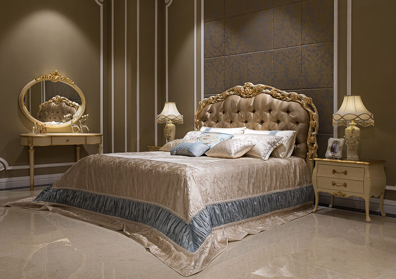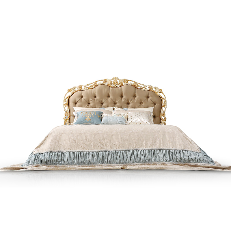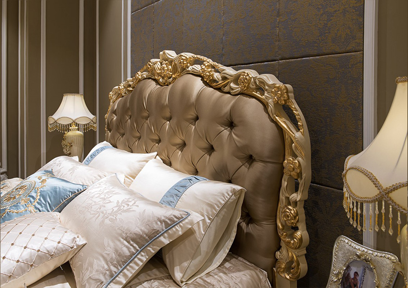 Classic French-Style Wooden Bed with Hand-Carved Frame and Fabric Headboard