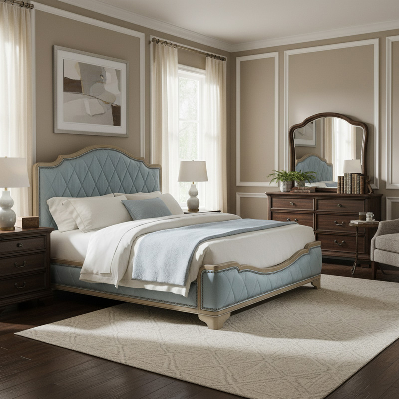 Designed for High-End Interior Scenarios The Morgan Manor Bed is a versatile masterpiece that thrives in a variety of upscale interior settings. In a grand master suite of a suburban estate, it serves as an elegant anchor for silk linens and plush area rugs. For luxury boutique hotels and high-end executive apartments, its refined American classical profile offers a "home away from home" feel that is both welcoming and prestigious. As a prominent name in export furniture, we designed this bed to pair effortlessly with traditional nightstands or contemporary metallic accents. Its elevated stance on carved block feet allows for easy cleaning and provides a light, airy feel to the room, making it a favorite for interior designers who want to achieve a balanced, "New Classic" bedroom layout.