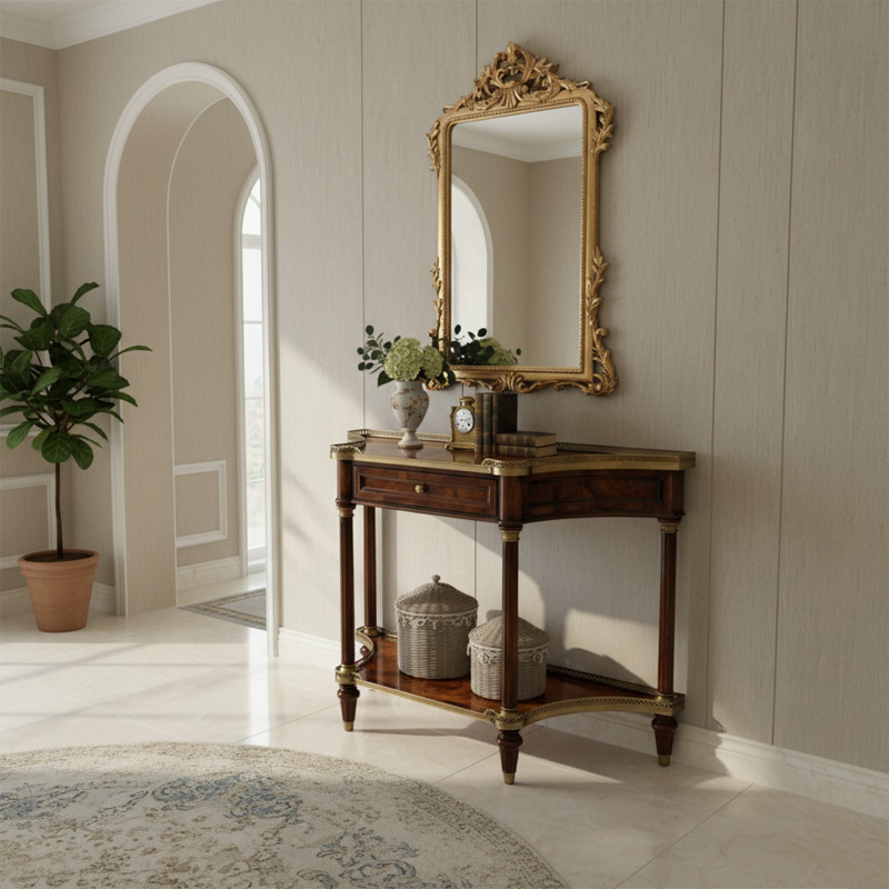Versatile Styling Scenarios for Modern Luxury While it is an obvious choice for a classical foyer, the Windsor Manor Heritage Console is remarkably versatile across various high-end interior scenarios. Its slim profile makes it an ideal "sofa table" in a formal living room, providing a platform for designer lamps, vintage books, or fine crystal. For those looking for premium export furniture, this piece serves as the perfect bridge between traditional European grandeur and the functional needs of a contemporary lifestyle. Imagine it placed beneath a large oil painting or an ornate gilded mirror; the dark wood tones and brass shimmer work together to create a curated gallery feel in any transitional space, from a sprawling suburban estate to a sophisticated metropolitan penthouse.