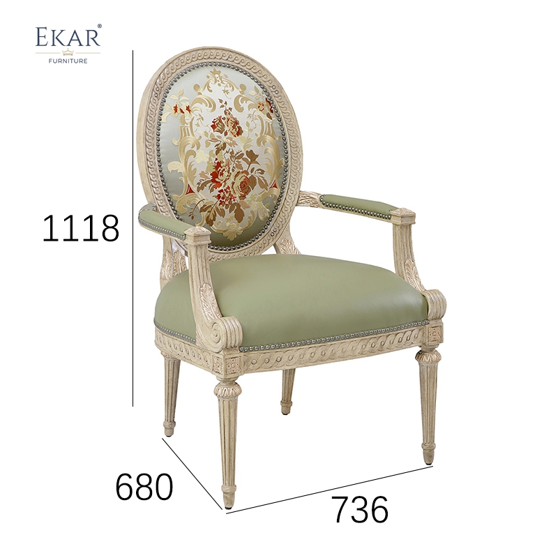 The EKAR Heritage Luxury Accent Chair is a masterful expression of American classical design, specifically curated to bring a sense of monumental elegance to the most refined homes. This exceptional piece of furniture is defined by its signature oval medallion backrest, which serves as a majestic architectural frame for the intricate artistry within. Its silhouette strikes a perfect balance between substantial presence and delicate poise, capturing the essence of high-end traditional aesthetics while meeting the proportions required for grand contemporary living spaces. Every curve of the wooden frame is meticulously shaped to provide a sense of historical gravity, ensuring the chair acts as a timeless anchor in any curated environment.