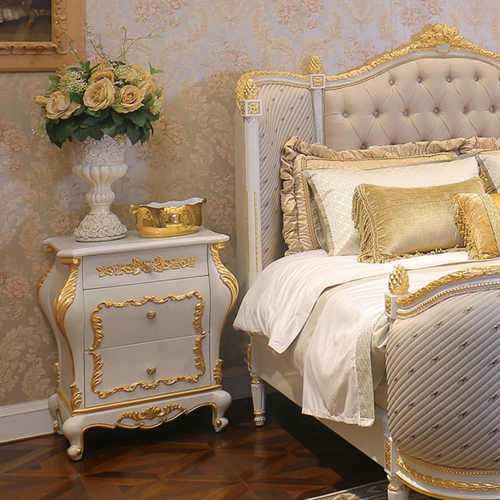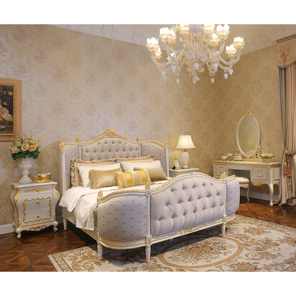 Upgrade your bedroom with this luxurious French-style bed, featuring plush upholstery and intricate craftsmanship for a sophisticated touch.