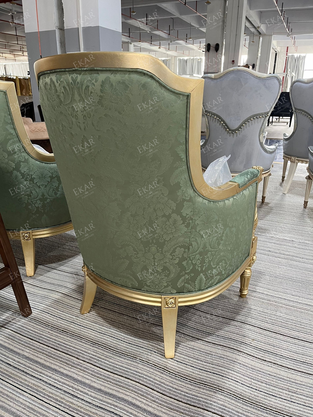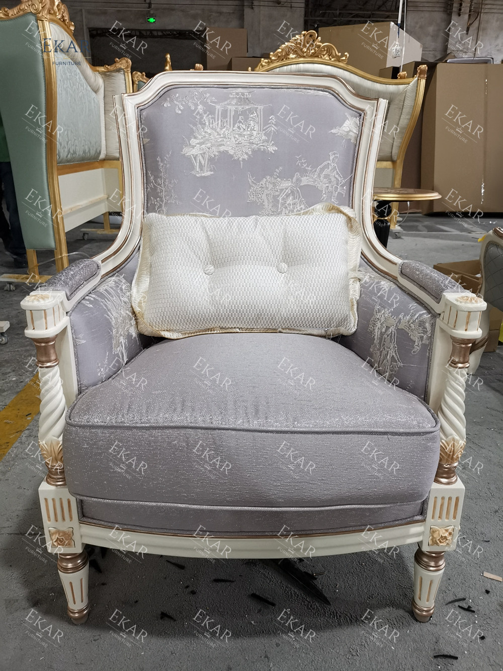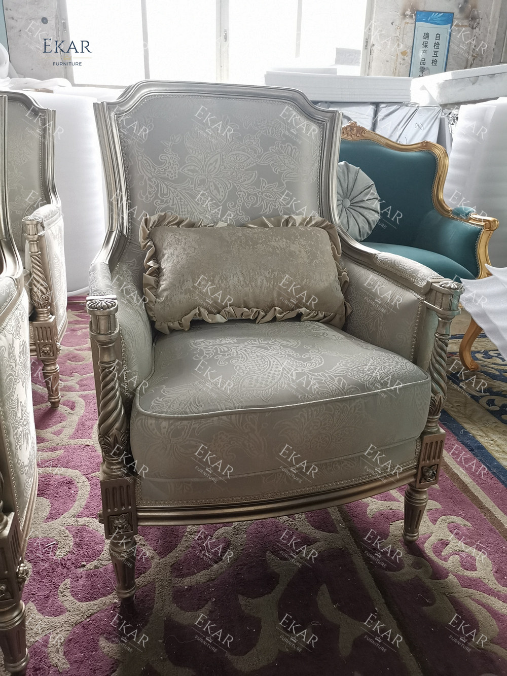 French-Style Wooden Lounge Chair with Upholstered Fabric Seat and Carved Frame
