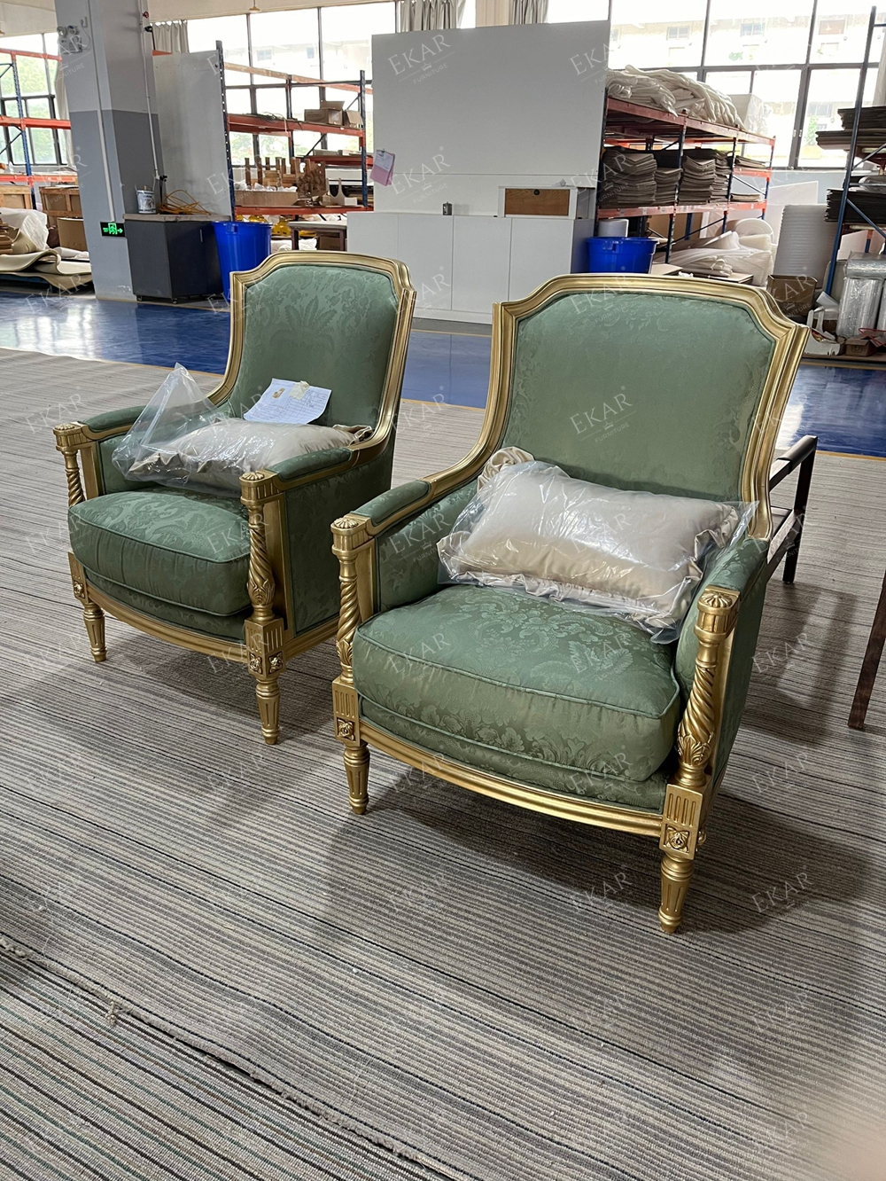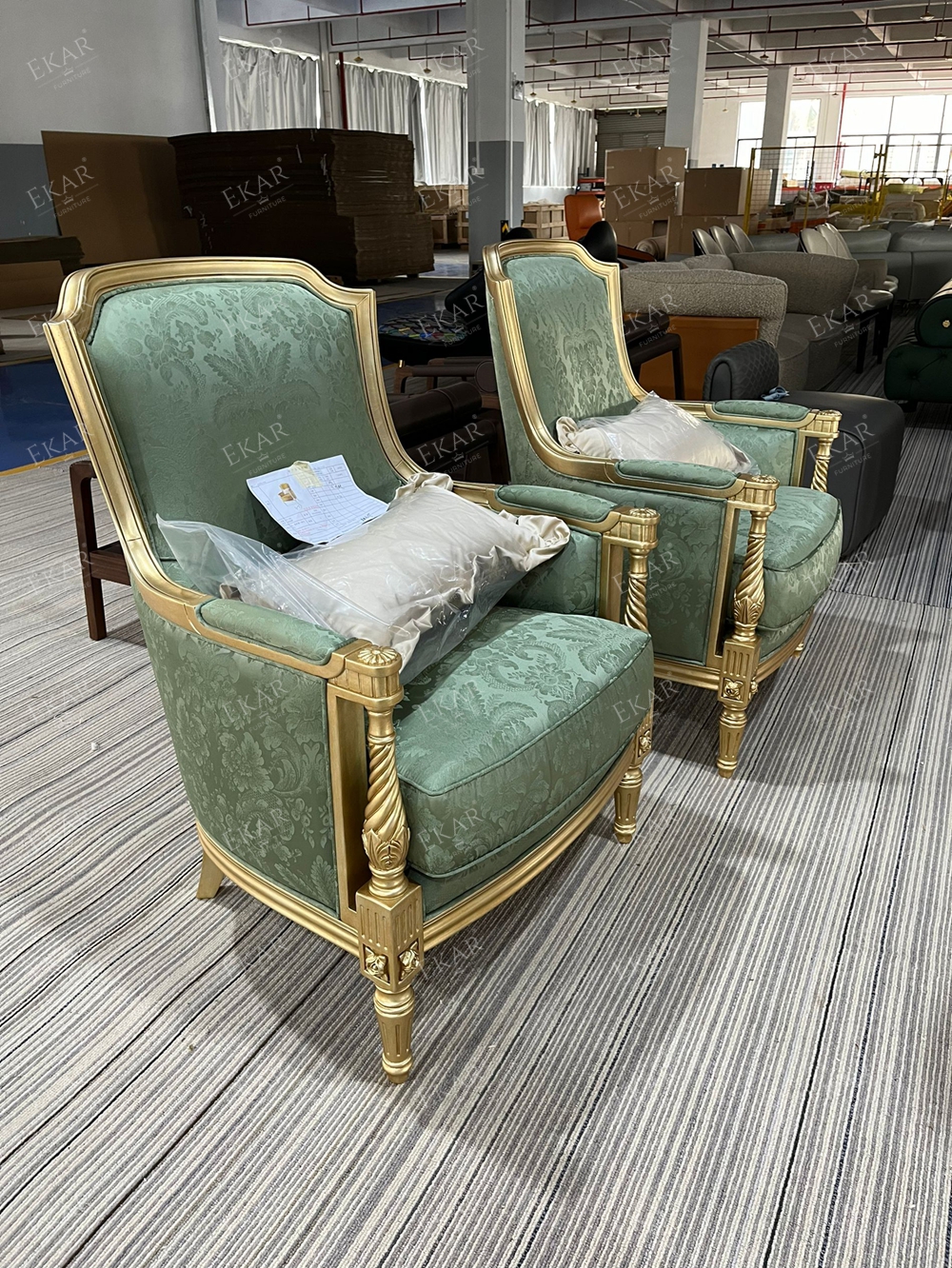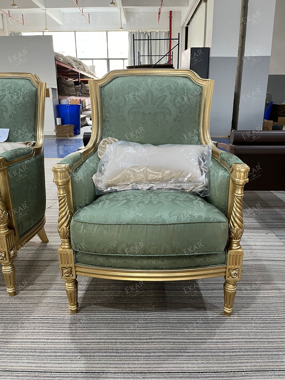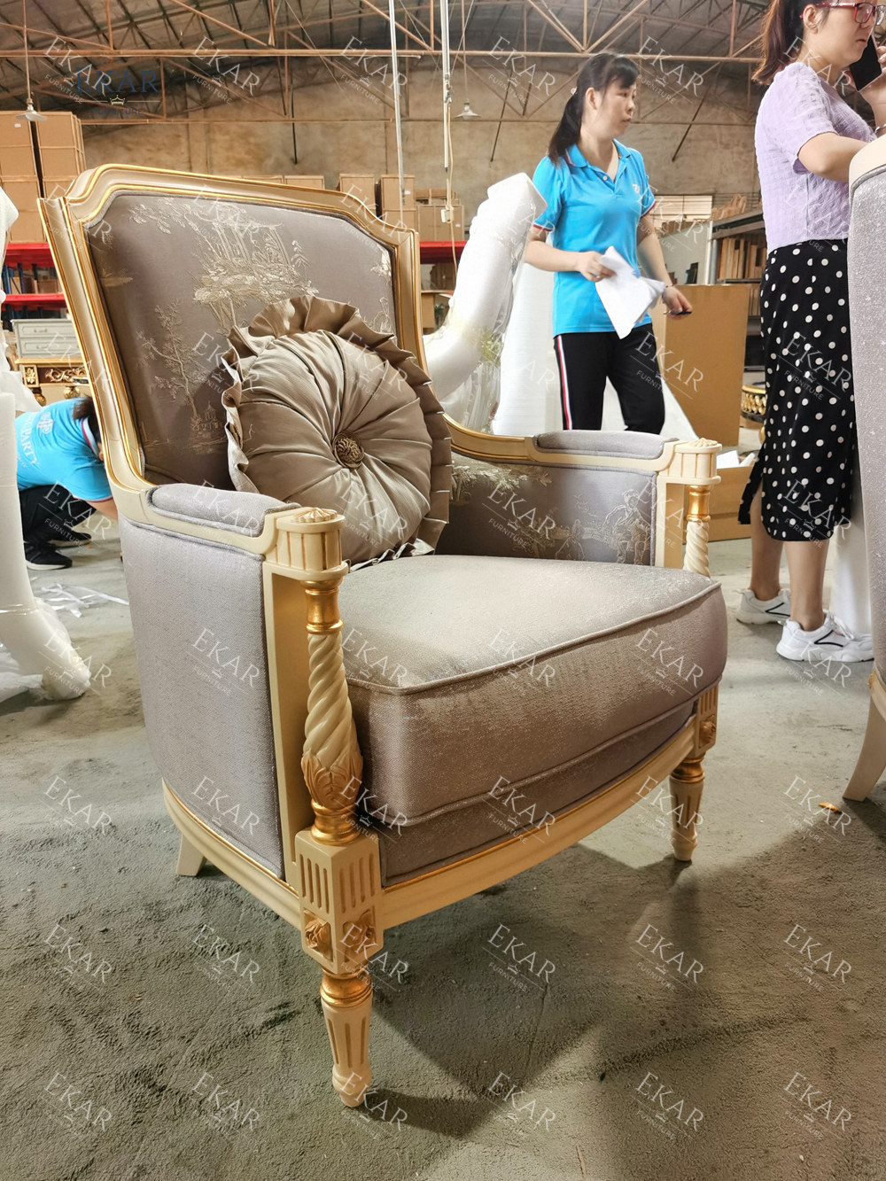 French-Style Wooden Lounge Chair with Upholstered Fabric Seat and Carved Frame