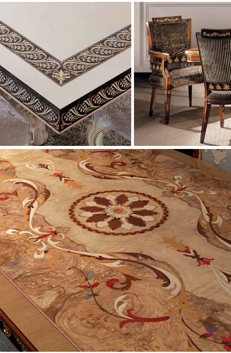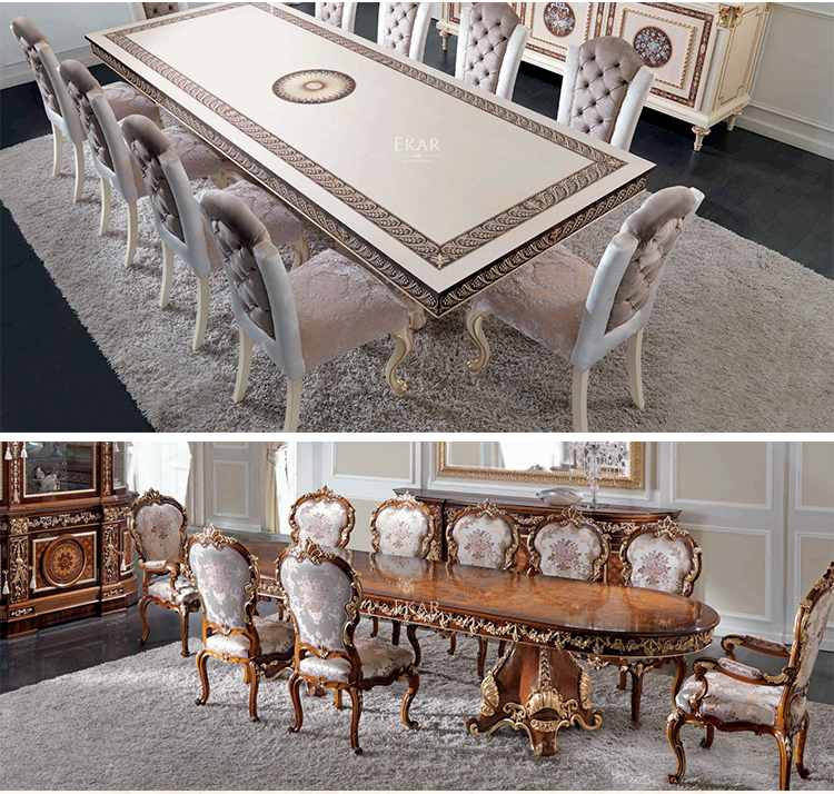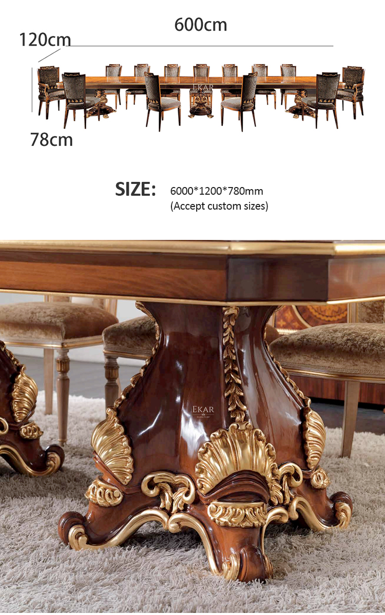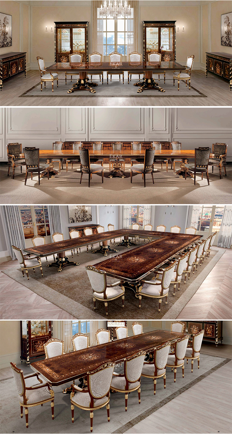 The design of the long dining table and chair set comes from the needs of customers in the Middle East countries. Our luxury royal dining table set models are some of the products we produce for the appreciation of our customers.