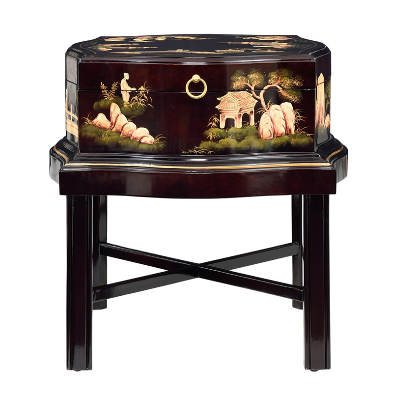 This square-shaped wooden end table features an intricate floral pattern, combining classic craftsmanship with creative design for a unique living room accent.